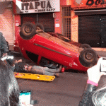 Na sequencia o Ford KA bate em um veiculo estacionado e tomba, O motorista e ajudado por populares a sair do veiculo. Ele aguardou socorro deitado na rua.