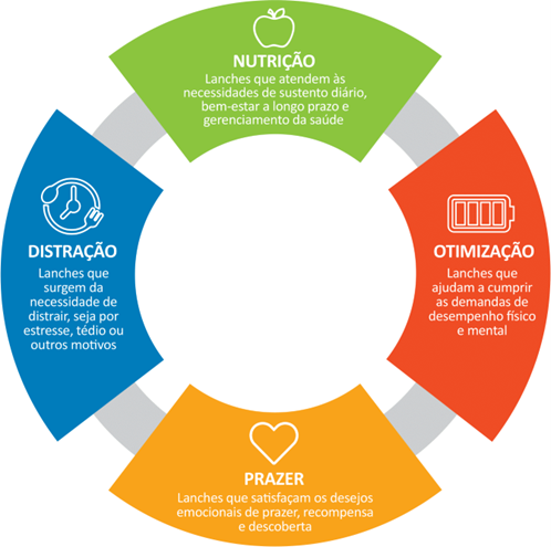Embora o lanche como substituto da fome continue sendo a principal razão para recorrer a produtos, os consumidores demonstram uma variedade de estados de necessidade. Houve aumentos perceptíveis na proporção de consumidores que fazem lanches para fins de indulgência, saúde e conforto nos últimos anos.
