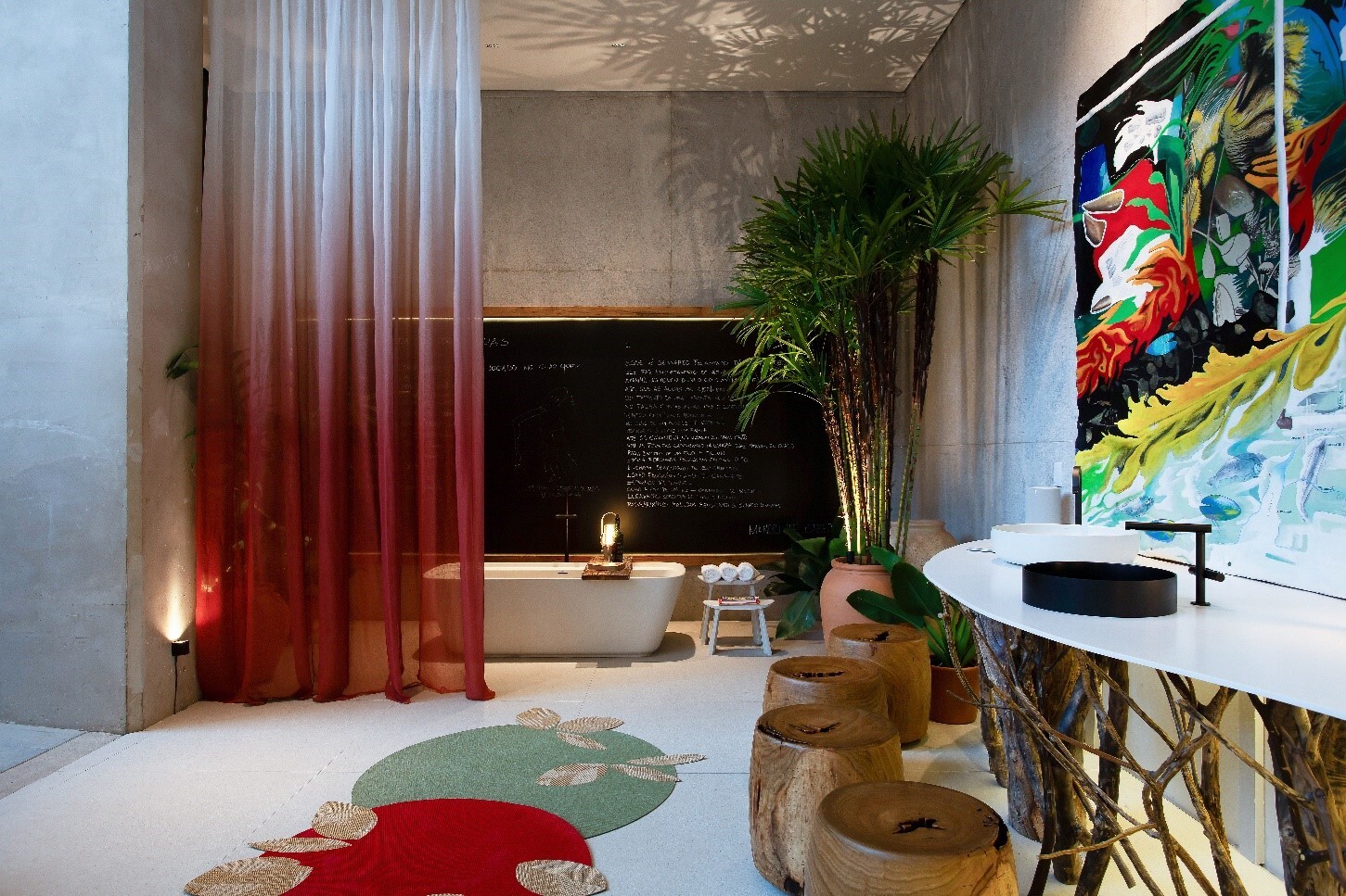 Ao final, o visitante se depara com um espaço de reflexão. “A Banheira Deca Senses com Apoio e Misturador para Banheira Arthur Casas de Piso em Black Matte foram colocados diante de um poema sobre as águas do Pantanal. A sustentabilidade reforça a mensagem de alerta de que o corpo humano habita essa morada”.