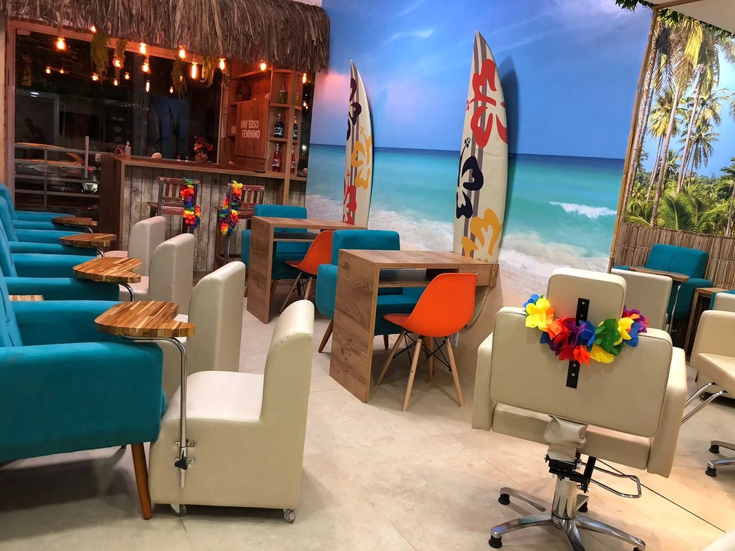 Um dos trabalhos da profissional que reflete essa personalização é o salão de beleza “Paraíso Estético Havaiano”, que teve como proposta inovar e levar ao público um espaço temático.