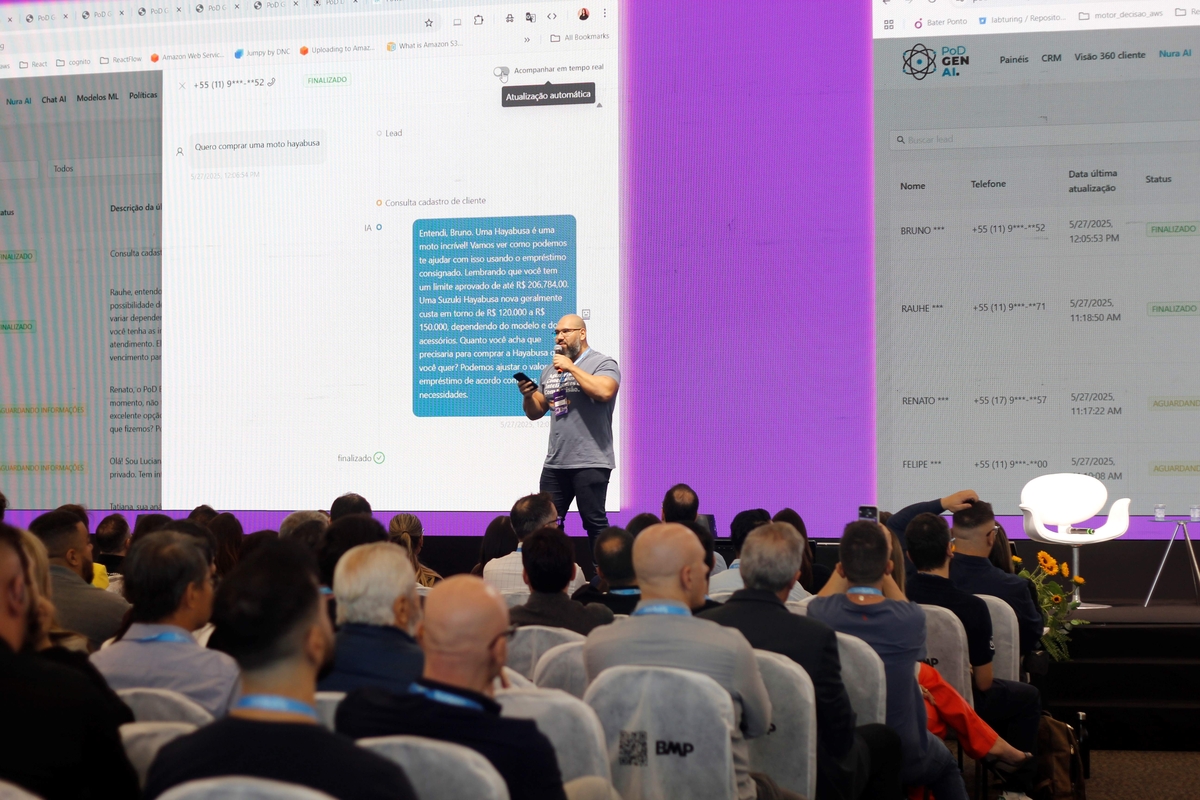“No evento, fiz uma apresentação, começando com uma palestra no palco principal para mais de mil pessoas, onde demonstrei, ao vivo, uma IA operando na prática, com toda a cadeia funcionando – desde o dado bruto no data lake, passando pelos modelos estatísticos, motor de decisão, IA, nuvem, até a interação no WhatsApp, com as pessoas podendo testar em tempo real”, comenta.