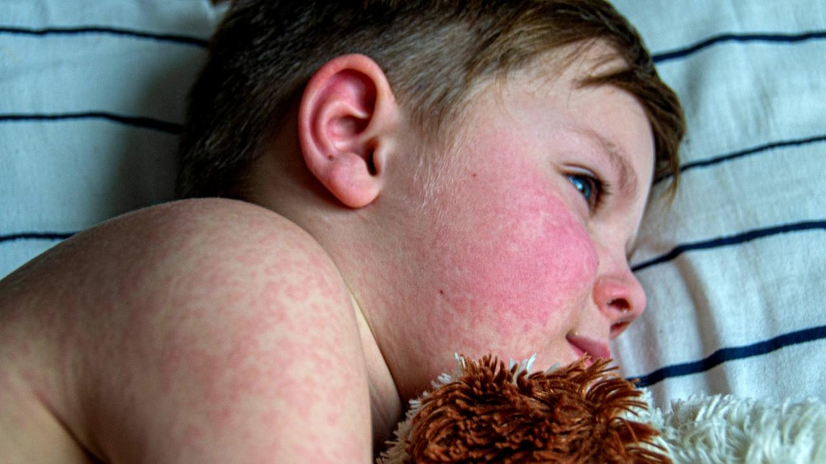 Entre os principais sintomas estão febre alta, manchas vermelhas na pele, olhos irritados e lacrimejantes, além de tosse e sinais semelhantes aos de um resfriado.