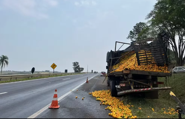 Toda a carga ficou espalhada pela pista durante a madrugada e o trecho precisou ser interditado para a retirada das laranjas. Uma pessoa que estava no ônibus sofreu ferimentos leves e recebeu atendimento no local, e o motorista do caminhão não se feriu.