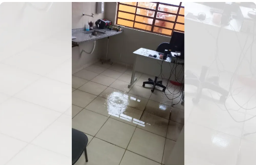 Imagens da unidade mostram goteiras no teto, consultórios e corredores alagados e equipamentos danificados.
