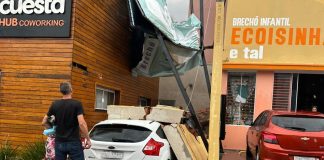 Ventania arranca placas de lojas e carro é atingido por muro...