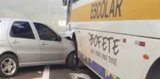 Carro colide com ônibus no trevo da Unesp em Botucatu
