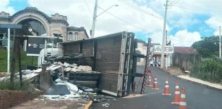 Caminhão com carga de mármore tomba durante manobra próximo da Estação...