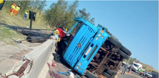 Dois ocupantes são socorridos com ferimentos graves após caminhão tombar em...