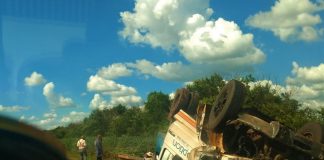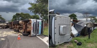 São Manuel: Caminhão tomba e fica com as rodas para cima...