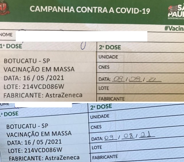 Já a segunda dose, que ocorre cerca de 3 meses depois, deverá ser aplicada em datas diferentes para alguns munícipes. Até o momento, nos cartões da vacina dos moradores de Botucatu, a grande maioria está assinalado o domingo de Dia dos Pais, 8 de agosto, como a data para a segunda dose.