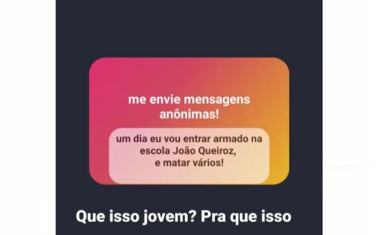 A reportagem recebeu nesta quarta-feira o print de uma postagem no instagram, anônima, onde uma pessoa escreveu: “Um dia vou entrar armado na Escola João Queiroz e matar vários”.