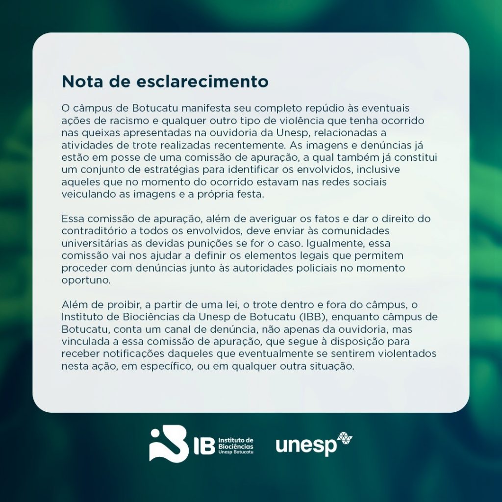 Através de uma nota oficial divulgada nesta quarta-feira, 30, o Instituto de Biociências de Botucatu (IBB), do câmpus da Unesp, afirmou que está apurando um caso de racismo, que teria ocorrido no final de semana, em uma festa de alunos.