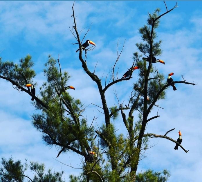Na foto, divulgada por Guilhermino Pinheiro, é possível ver, pelo menos 8 tucanos na árvore. “Um pé de tucanos na estrada Alcides Soares. Entrada do Lageado”, postou o autor.