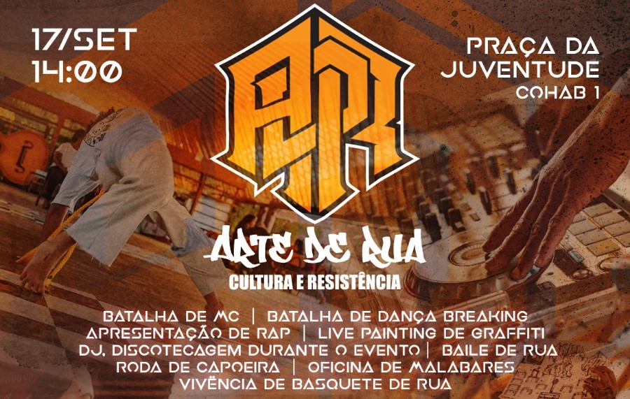 Mostra de arte urbana oferece gratuitamente à comunidade ações de dança Breaking, Graffiti, DJ, MC, Rap, malabares, Skate, basquete de rua, capoeira, circo.