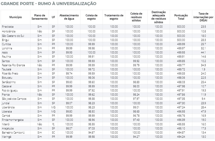 Para entrar na categoria “Rumo à Universalização”, o município deve alcançar pontuação total superior a 489 pontos no ranking, com nota máxima de 500. A nota total é alcançada com a soma dos pontos obtidos em cada item: abastecimento, coleta de esgoto, tratamento de esgoto, coleta de resíduos sólidos e destinação adequada dos resíduos sólidos.
