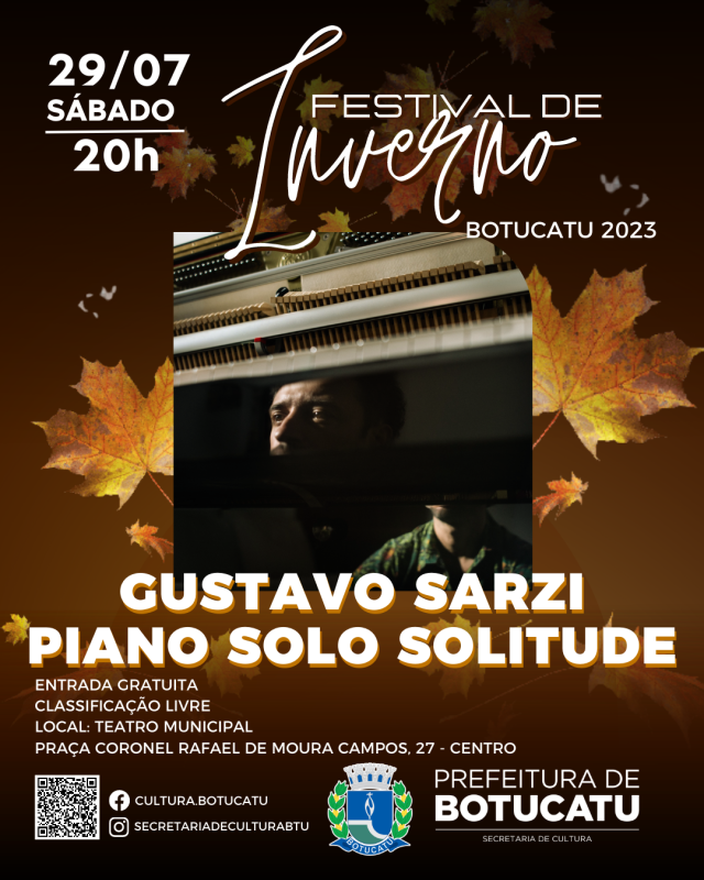 Festival de Inverno de Botucatu 2023: “Solitude, um monólogo-pianístico”. Show solo do pianista Gustavo Sarzi, com composições próprias e novas faixas. Entrada gratuita no Teatro Municipal.