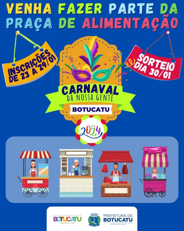 A partir do dia 23 de janeiro, os interessados em participar da Praça de Alimentação do aguardado Carnaval da Nossa Gente 2024 já podem acessar o formulário online de inscrição. O evento será realizado na Praça da Secretaria de Educação nos dias 10, 11 e 12/02/2024, das 15h às 22h.