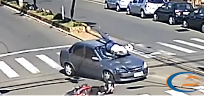 Com a colisão, o motociclista foi arremessado contra o para-brisa do automóvel e, em seguida, ao chão. As imagens mostram que o semáforo estava vermelho para o carro, enquanto o sinal estava aberto para o motociclista, reforçando a irresponsabilidade do motorista.