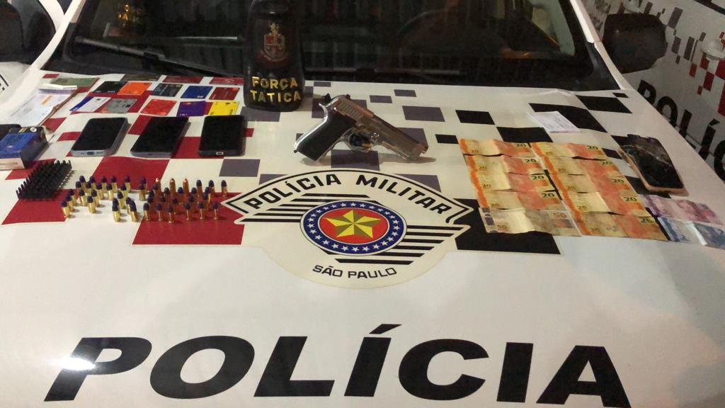 As buscas nos veículos confirmaram as declarações dos abordados. No Hyundai HB20, ocupado pelo indivíduo 1 (condutor) e indivíduo 3 (passageiro), os policiais encontraram uma pistola Taurus calibre 9mm municiada com 17 cartuchos, além de três aparelhos celulares, 13 cartões bancários e um talão de cheques, todos em nome do indivíduo 1.