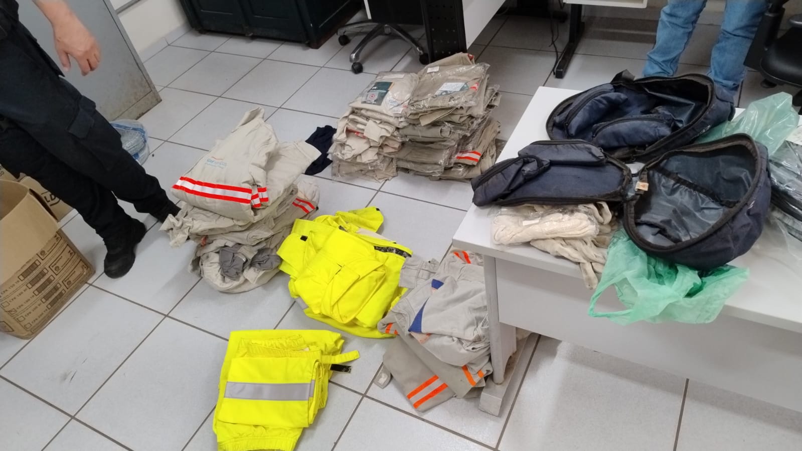Durante as diligências, os agentes localizaram diversas peças de uniformes pertencentes a uma empresa de energia, incluindo calças, blusas, capacetes, óculos e luvas. Além disso, foram encontrados vários maços de cigarros de origem estrangeira, cuja comercialização é proibida no Brasil.