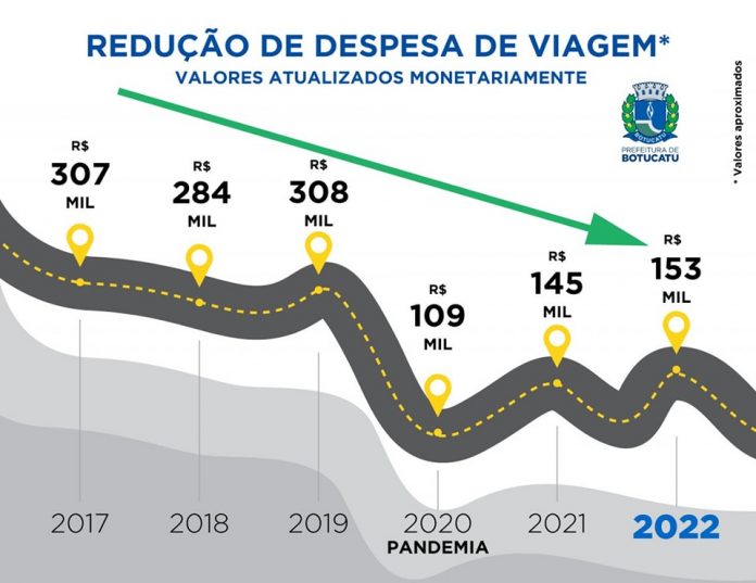 De acordo com ele, em 2017, a Prefeitura de Botucatu gastou R$ 307 mil por ano em despesas com alimentação e hospedagens durante viagens. Já em 2022, após 5 anos, a redução foi de mais de 50%, com uma queda para R$ 153 mil.