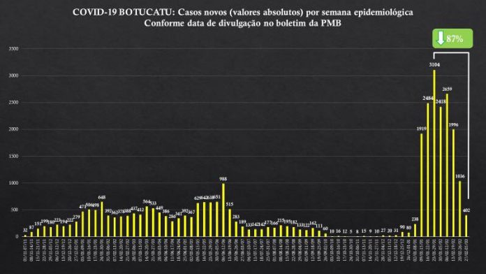 De acordo com o Poder Público, houve uma redução de 87% em comparação com a semana entre os dias 23 e 29 de janeiro, quando houve o pico de casos positivos, com 3.104 casos de Covid registrados.