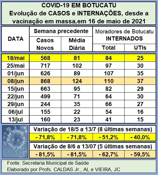 Na última terça-feira, 13 de julho, oito semanas após a Vacinação em massa, o número de internados caiu para 41, com 15 na UTI. A redução de internados foi de 51,2%. De pacientes na UTI Covid, Botucatu teve uma redução de 40%.