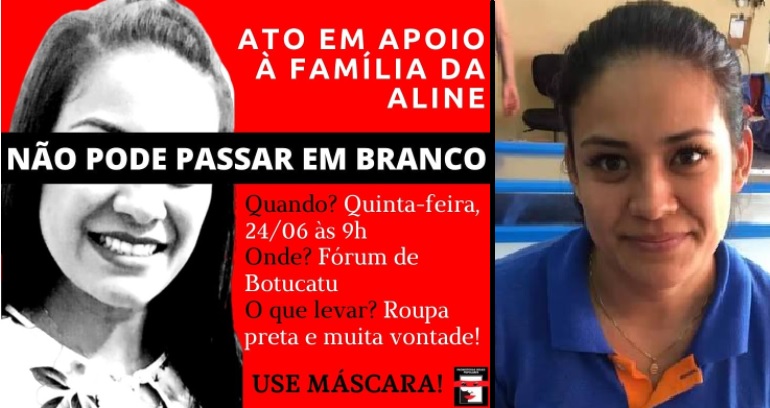 O Grupo “Promotoras Legais Populares Botucatu” realizará nesta quinta-feira, 24, em frente ao Fórum de Botucatu, um ato em apoio à família de Aline Aparecida da Silva, de 28 anos, que foi morta em casa pelo marido, em setembro de 2019.