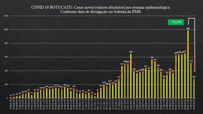 De acordo com dados da Prefeitura, nesta última semana foram registrados 283 novos casos de Covid em Botucatu. O número é 71,3% menor do que a cidade atingiu no início do mês, quando havia totalizado 988 casos positivos da doença.