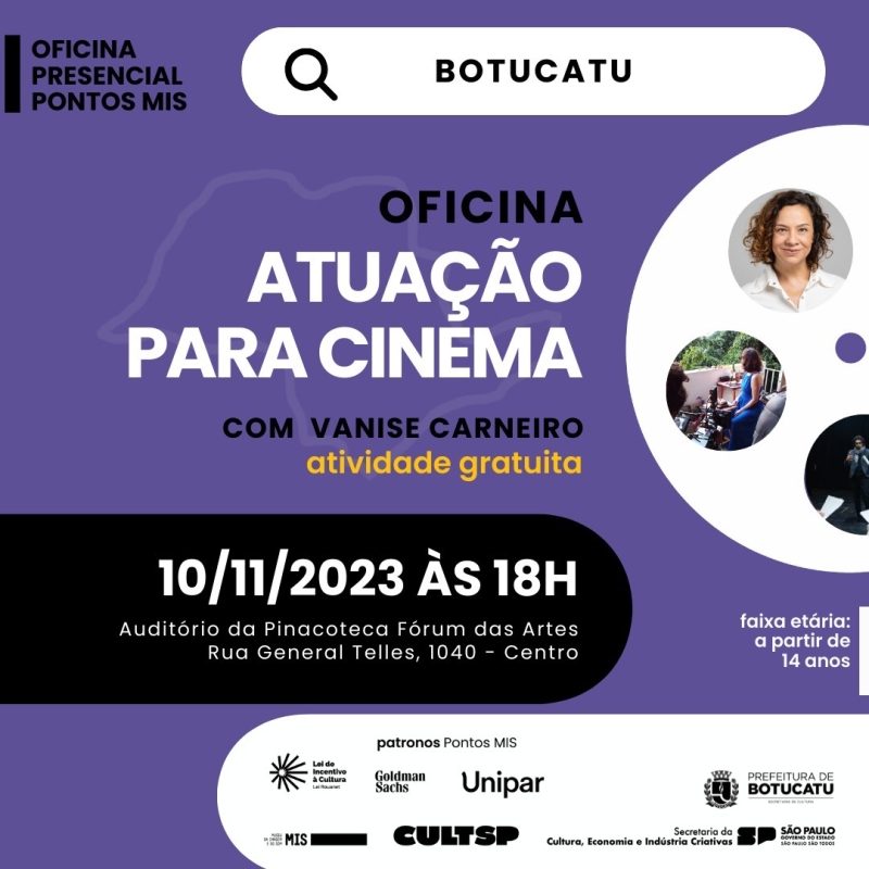 Este evento é realizado em colaboração entre a Secretaria Municipal de Cultura de Botucatu e o Pontos MIS do Museu da Imagem e do Som. Será ministrado por Vanise Carneiro, uma atriz, diretora, educadora, preparadora de elenco e pesquisadora em cinema. Com vasta experiência no cinema e teatro, Vanise é a escolha ideal para guiar os participantes no mundo da atuação cinematográfica.