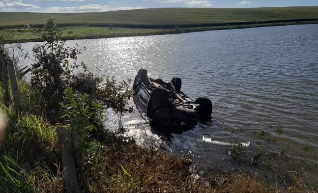 Um carro caiu em uma lagoa às margens da estrada rural que liga os municípios de Pardinho e Botucatu (SP), na manhã de domingo (16).