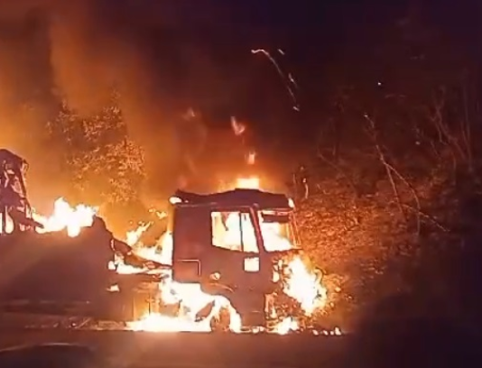 Carreta carregada com 55 toneladas de madeira pega fogo e interdita a Rodovia Castello Branco