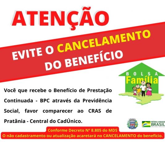 Atenção beneficiários do BPC (Benefício de Prestação Continuada) de Pratânia. Quem ainda não se inscreveu, precisa se inscrever no Cadastro Único.