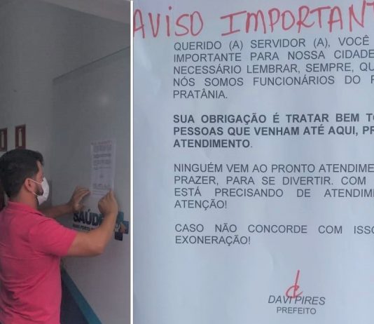 Na imagem é possível ver o Prefeito colando um papel no Pronto Atendimento de Pratânia exigindo que os funcionários atendam bem as pessoas.