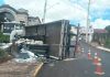 Caminhão com carga de mármore tomba durante manobra próximo da Estação...