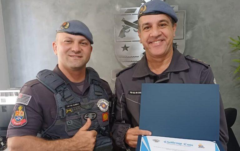 Na manhã desta quarta-feira (22), o Tenente-Coronel PM Alexander Cagliari Machado, Comandante do 12º Batalhão de Polícia Militar do Interior (BPM/I), recebeu a Challenge Coin do 55º BPM/I, como forma de reconhecimento e respeito entre as corporações.