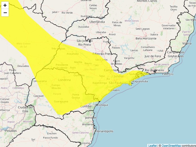 De acordo com o Instituto Nacional de Meteorologia (INMET), o primeiro alerta, classificado com grau de severidade “Perigo Potencial”, prevê chuva entre 20 e 30 milímetros por hora, podendo chegar a 50 milímetros por dia, além de ventos de 40 a 60 km/h. O aviso teve início às 9h19 desta terça-feira e segue até as 10h de quarta-feira (8).
