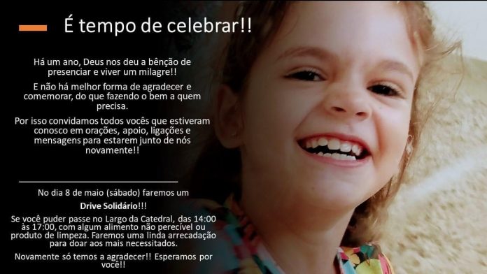 Para agradecer a cura de Marina, familiares e amigos organizaram um Drive Solidário no dia 8 de maio, em frente da Catedral de Botucatu.