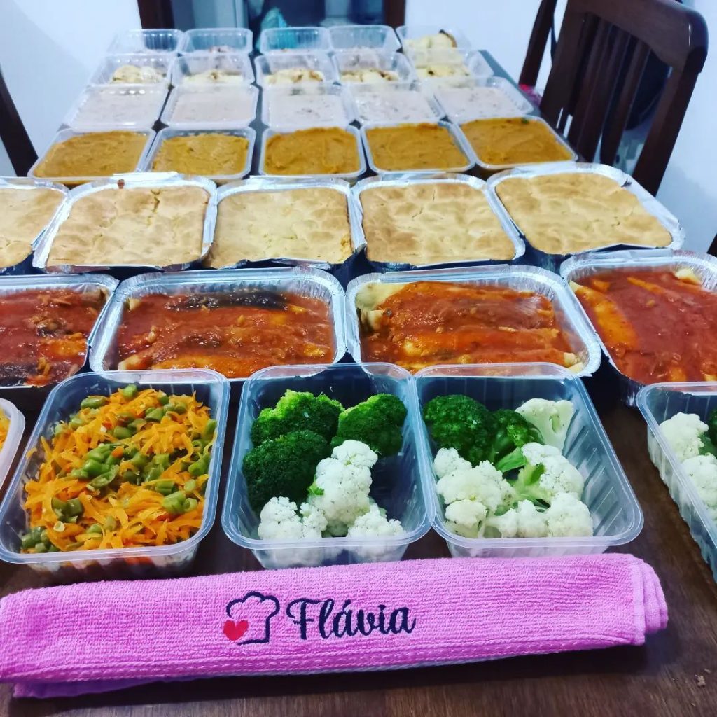 Flávia trabalha com pratos do dia a dia, oferecendo um cardápio variado com mais de 40 opções que vão desde pratos simples, como carne de panela, até frutos do mar. Ela permite que os clientes escolham seis opções do cardápio, que ela prepara quinzenalmente para a família toda. Flávia é capaz de lidar com todas as restrições alimentares dos clientes, adaptando os pratos para atender aos gostos e necessidades individuais.