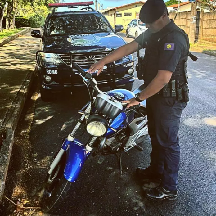 Durante patrulhamento pelo bairro Jardim Bandeirantes, a equipe ROMU 1 foi acionada pelo Centro de Operações Integradas (COI) às 13h30 com a informação de que uma motocicleta Honda CBX Twister 250, cor azul, registrada como furtada, havia sido identificada pela Muralha Virtual.