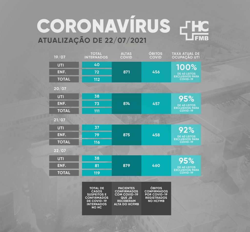 O Hospital das Clínicas da Faculdade de Medicina de Botucatu (HCFMB) atualizou nesta quinta-feira, 22 de julho, as informações sobre a Covid-19.