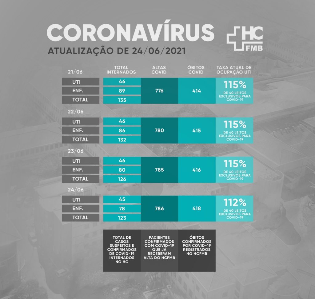 De acordo com dados divulgados pelo HC nesta quinta-feira, 24, já foram registradas 786 altas de pacientes que venceram a Covid, 418 óbitos em função da doença e 123 pessoas que ainda estão internadas em tratamento. No total, são 1.327 pacientes atendidos com Covid-19 desde o início da pandemia.