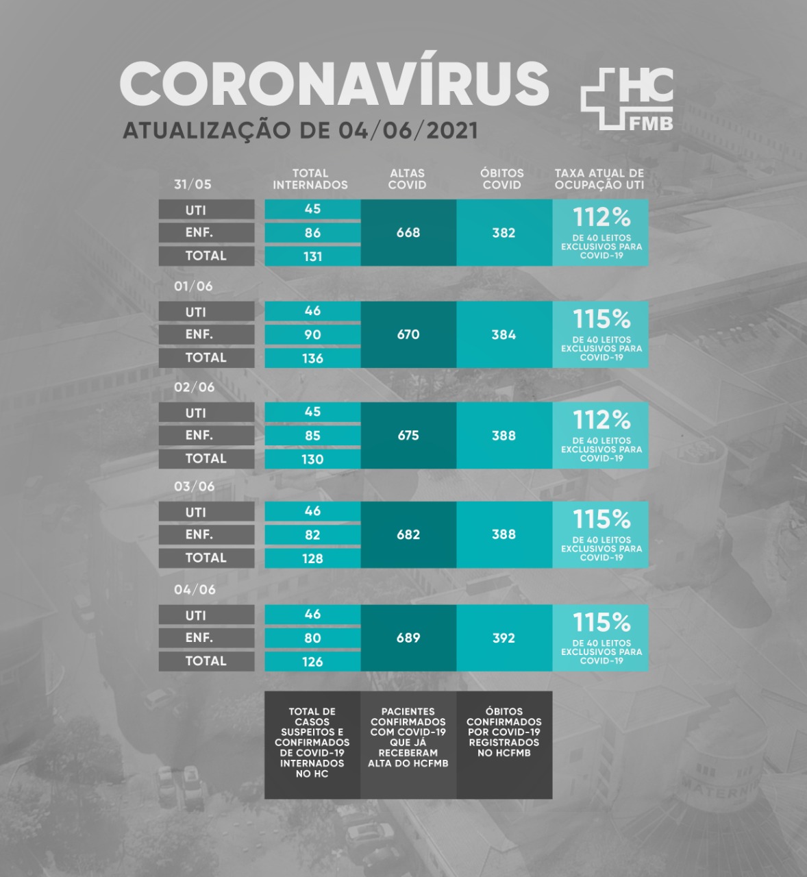 O Hospital das Clínicas da Faculdade de Medicina de Botucatu (HCFMB) atualizou nesta sexta-feira, 4, de junho, as informações referentes à Covid-19.