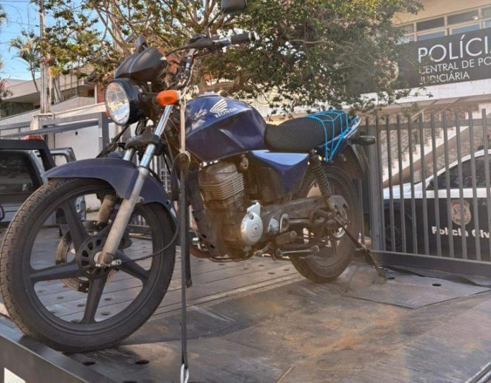 Diante da situação, foi realizada a abordagem e, durante a averiguação, constatou-se que a placa afixada na motocicleta correspondia a outro veículo registrado em município diferente, indicando adulteração do sinal identificador.