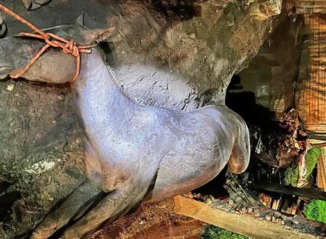 O Corpo de Bombeiros de Itatinga socorreu um cavalo que estava dentro de uma fossa de dejetos, na noite de domingo, 26.