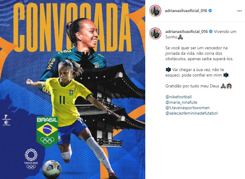Das 18 jogadoras chamadas por Pia para Tóquio, 11 já disputaram as Olimpíadas. Já Adriana está entre as sete estreantes no torneio olímpico, ao lado da lateral-esquerda Jucinara, das meias Julia Bianchi e Duda, da goleira Letícia e das atacantes Ludmila e Geyse. “Vivendo um Sonho. Se você quer ser um vencedor na jornada da vida, não corra dos obstáculos, apenas saiba superá-los”, comemorou a Adriana após a convocação.