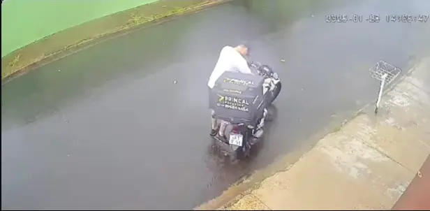 A moto, que estava equipada com um baú Princal Baterias, foi levada em meio às intensas chuvas e ventos, o que causou ainda mais dificuldade para a identificação dos suspeitos.