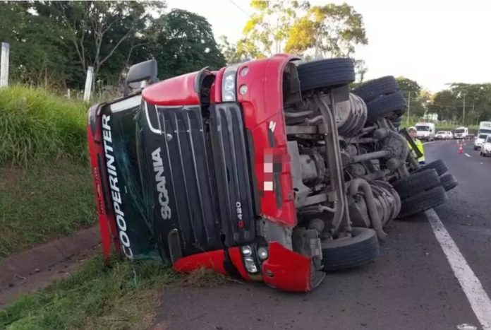 Segundo a Polícia Militar Rodoviária, o caminhão, que transportava peças automotivas, seguia em velocidade acima da permitida e tombou ao fazer uma curva acentuada. A carga ficou espalhada pela pista.