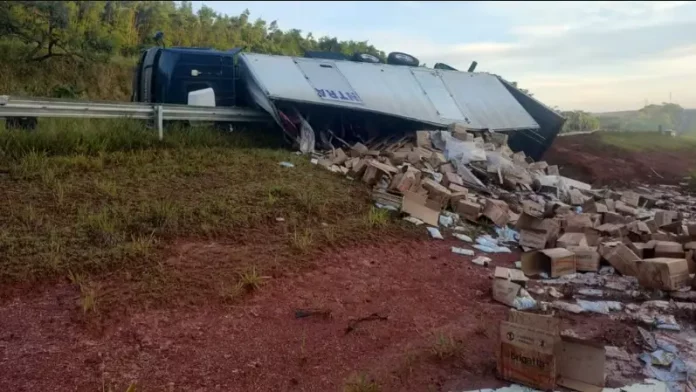 De acordo com a Polícia Rodoviária, a ocorrência foi registrada por volta das 5h no km 9,4 da pista, onde o veículo tombou na primeira faixa de rolamento. A carga do caminhão, que transportava produtos de uma empresa alimentícia, ficou espalhada no canteiro lateral.