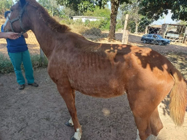 Ao chegar à propriedade, os investigadores do DEPA constataram uma cena angustiante. Três animais – dois equinos e um asinino – estavam submetidos a condições desumanas, sem acesso a água e comida, apresentando um estado corporal extremamente debilitado e uma alta infestação de carrapatos.